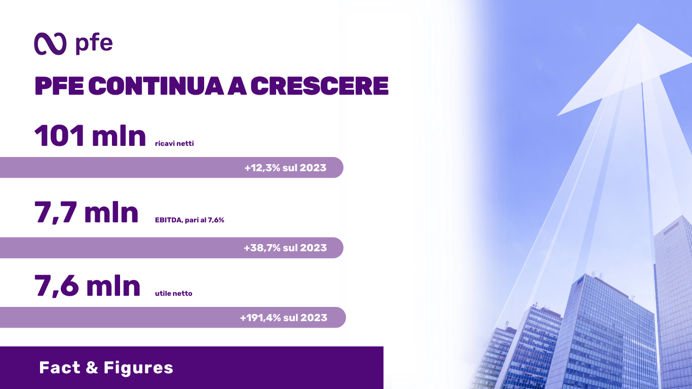 Il 2024 si è chiuso infatti con risultati molto positivi, pienamente in linea con gli obiettivi dell’ambizioso Piano Industriale di Gruppo al 2027. Pfe ha registrato ricavi netti superiori ai 101 milioni di euro, segnando una crescita del 12,3% rispetto all’anno precedente. L’EBITDA ha raggiunto il 7,6%, per un valore di oltre 7,7 milioni di euro, con un incremento del 38,7% sul 2023. Ancora più significativa la crescita dell’utile netto, che si attesta a 7,6 milioni di euro, in aumento del 191,4% rispetto all’anno precedente.